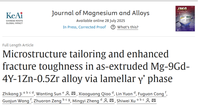 以上内容以“Microstructure tailoring and enhanced fracture toughness in as-extruded Mg-9Gd-4Y-1Zn-0.5Zr alloy via lamellar γ’ phase”发表在Journal of Magnesium and Alloys上。