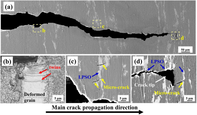 图8.不连续断裂韧性测试中QE样品中平面截面的显微组织,(a)整个裂纹扩展路径,(b)主裂纹附近变形晶粒中的孪晶,(c)块体LPSO相诱导的微裂纹,(d)主裂纹尖端前方的微裂纹。