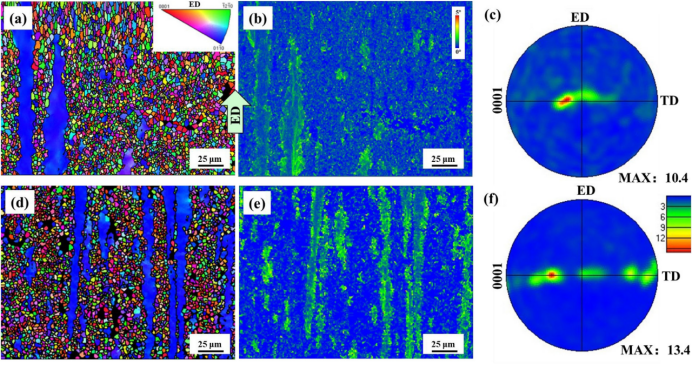 图3.挤压态合金的EBSD结果:(a,d)IPF图;(b,e)KAM图和(c,f)(0001)极图;(a-c)QE样品和(d-f)FE样品。