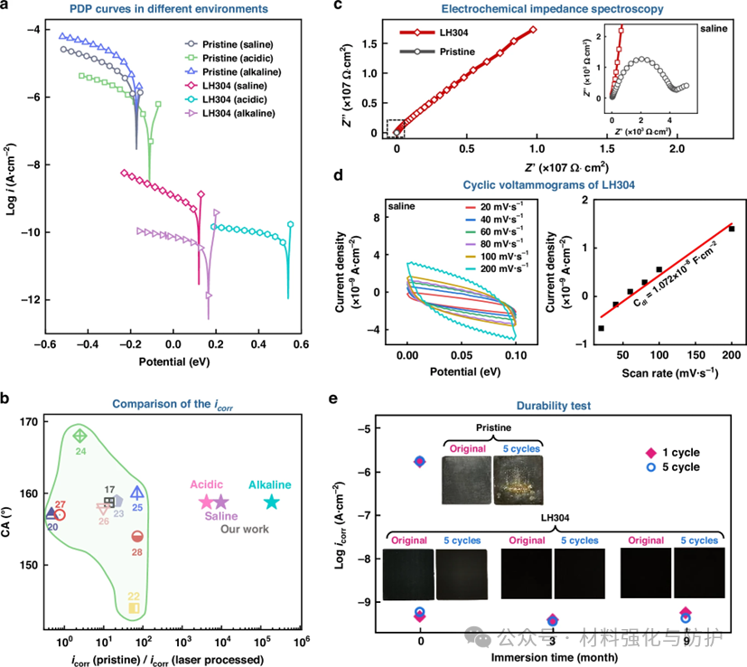 团队分别在NaCl、HCl和NaOH溶液进行腐蚀试验,分别表征LH 304不锈钢在盐、酸和碱性环境中的腐蚀情况,结果显示LH 304的腐蚀电流密度降低了4~5个数量级,且腐蚀速率的降低相较于目前报道的其他先进防护技术效果更为明显(腐蚀速率要更低2~3个数量级),经过9个月(>6500h)浸泡后,样品的表面依然光亮如初,未见明显的腐蚀迹象。