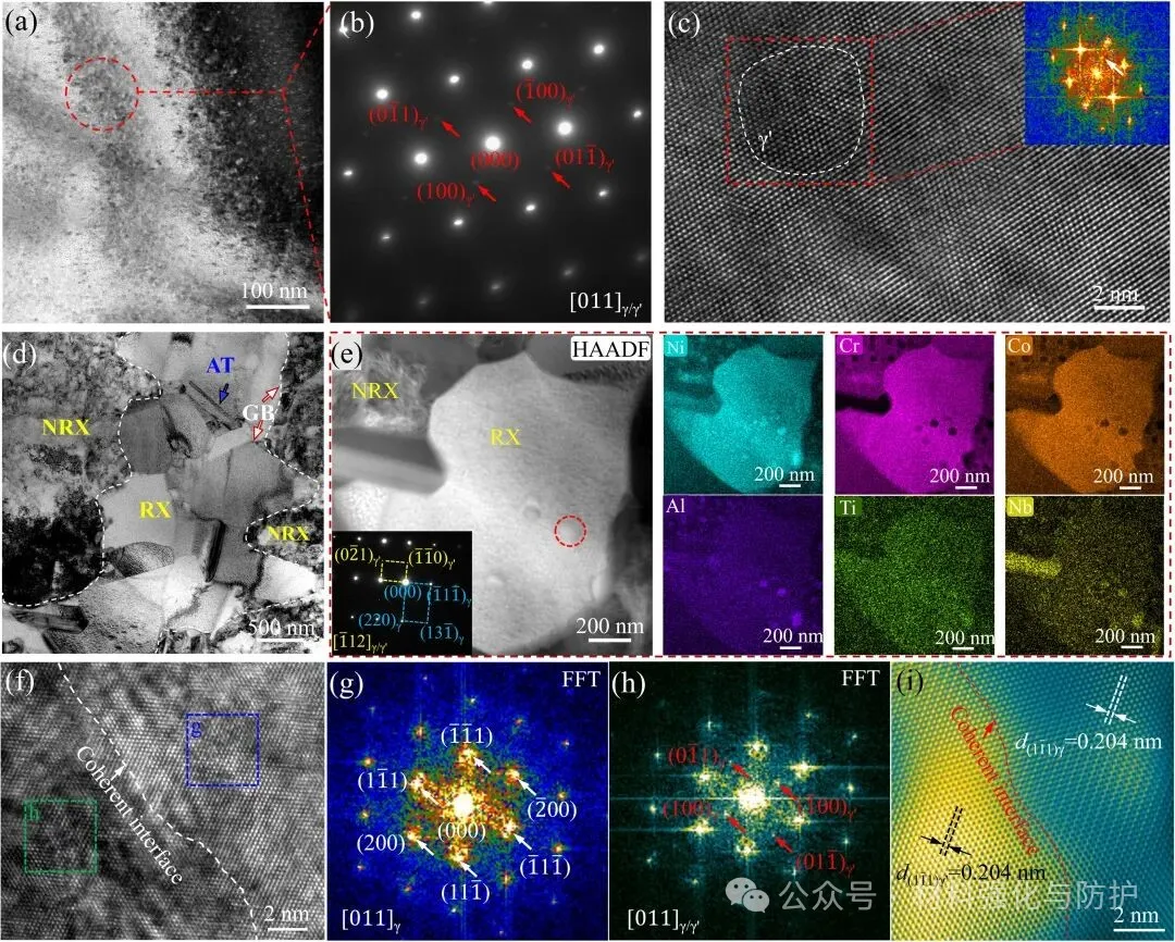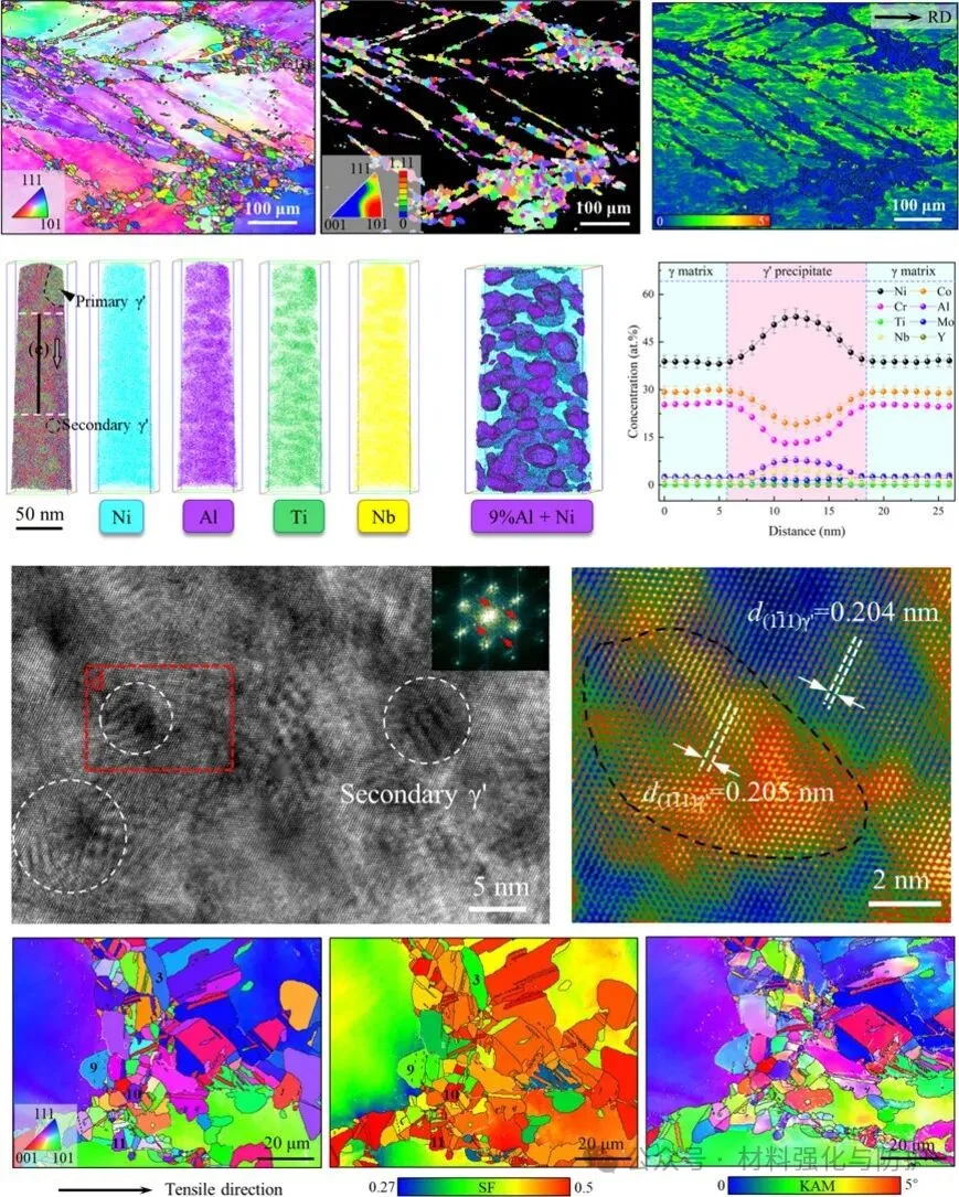 团队通过异步轧制诱导应变累积、980℃退火获得在硬度上差距较大的双峰晶粒结构,并在720-620℃两阶段的时效中实现了尺寸上的双峰γ’析出相分布(粗大初级γ’≈73nm,细小次级γ’≈16nm),这种多尺度异质结构调控的策略显著提升了合金的强化效果与应变协调能力。