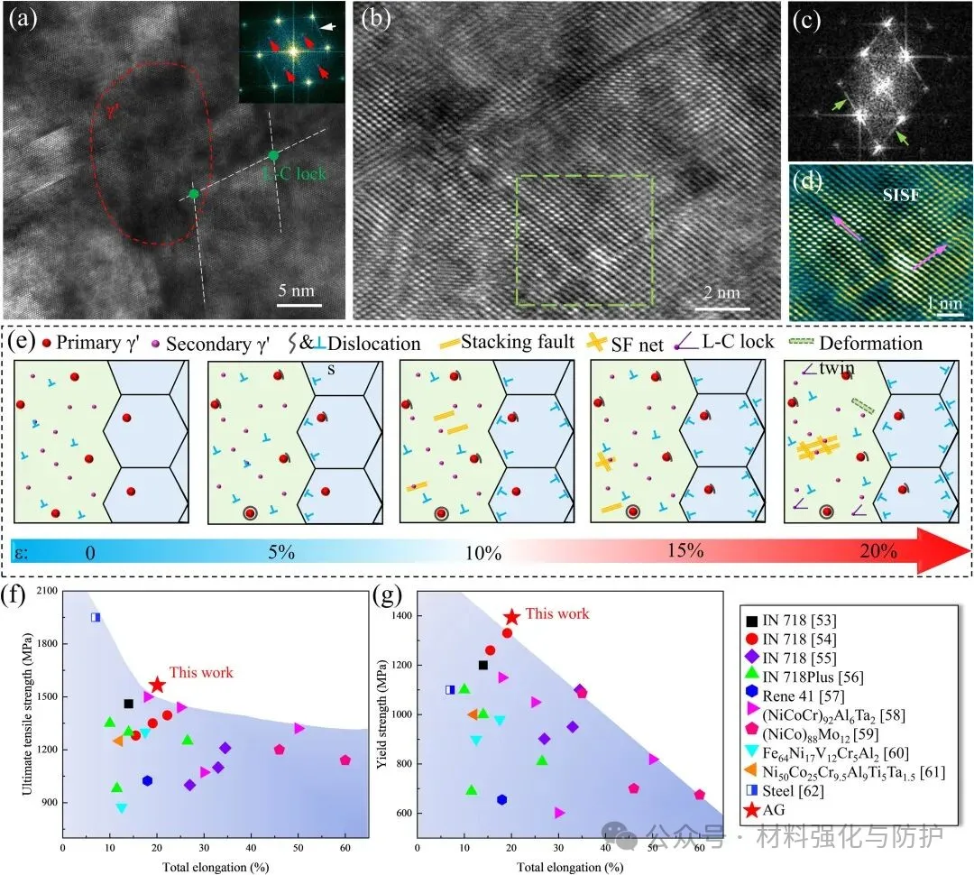团队发现,随着应变从5%逐渐增加至20%,这一过程汇总合金内部先后激活了多滑移系、Lomer-Cottrell锁、变形孪晶与堆垛层错网络等机制,这些机制协同作用,显著提升了合金的位错累积与应变硬化能力,实现材料高强度与高延展性的平衡。