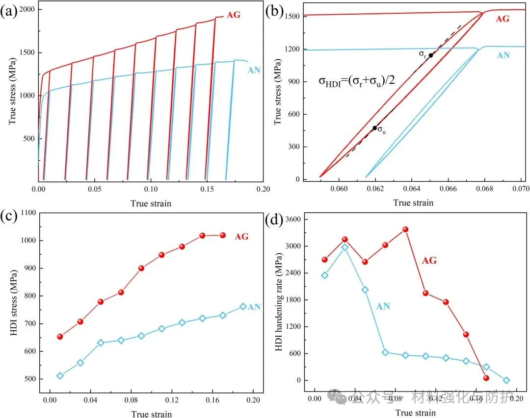 独特的微观结构进一步加剧了合金内部不同结构之间的机械性能不匹配,从而进一步激活了HDI强化,LUR循环拉伸实验显示,在变形初期,AG态样品的HDI应力可达653MPa,显著高于退火态(512MPa),当应变在0.05-0.09之间时,AG样品的HDI加工硬化率再次增加,团队将这一现象归因于析出物的贡献。