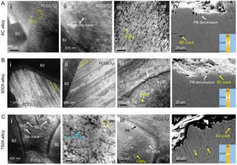 研究团队结合多尺度表征、第一性原理计算及深入分析,系统揭示了高熵合金的“韧-脆-韧”转变机制。1)L12过有序+锯齿状相界的协同脆化:研究表明,中温时效诱导L12发生过有序化,同时形成锯齿状的B2/FCC(L12)相界。一方面,L12过有序导致高度局域化的平面滑移带;另一方面,锯齿状的非共格相界严重阻碍位错跨越界面滑移,导致界面处产生应力集中。当高度局域化的平面滑移带冲击这些滑移传递不利的相界面时,局部应力迅速超过B2相的断裂极限,诱发脆性断裂。2)L12有序度降低+韧性过渡界面的协同韧化:在非脆性温度区间时效时,高扩散能力使得L12有序度降低,激活多滑移与交滑移,显著提升合金的均匀变形能力。更关键的是,锯齿状界面转变为平滑界面,并在B2/FCC(L12)相界附近形成富Cr析出相缺失区(CRPs-free zone)。该区域内的富Cr相(CRPs)在热作用下溶解消失,形成韧性过渡区,使B2相边缘与FCC(L12)基体的变形能力更为匹配,有效缓解界面应力集中。从而显著抑制局域变形和脆性开裂倾向,展现出优异的强塑性。