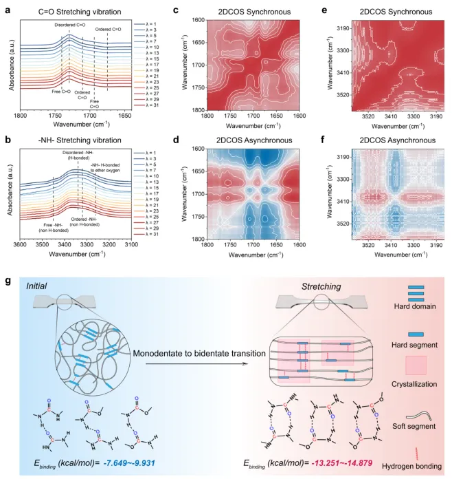 图3 | 拉伸过程中氢键的变化 a. 不同拉伸比下C=O伸缩振动FT-IR光谱。 b. 不同拉伸比下–NH–伸缩振动FT-IR光谱。 c, d. HPWPUE在1800–1600 cm⁻¹波段计算的同步与异步2DCOS谱。 e, f. HPWPUE在3500–3200 cm⁻¹波段计算的同步与异步2DCOS谱。 g. 氢键从单齿向双齿转变的示意图及结合能计算值。