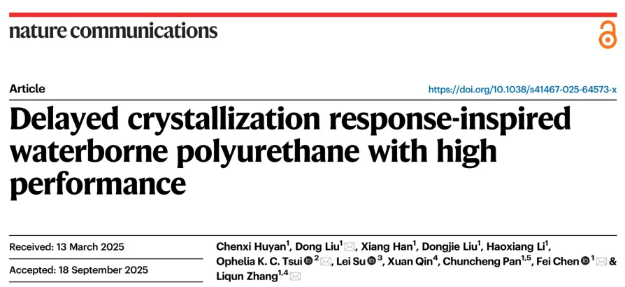 近日,西安交通大学张立群院士、陈飞特聘研究员、刘栋副教授和香港科技大学Ophelia K. C. Tsui教授合作,成功开发出高性能水性聚氨酯弹性体(HPWPUE),它不仅符合绿色化学原则,更实现了惊人的0.959 GJ/m³韧性和81.8 MPa的强度。这一成果得益于一种称为“延迟结晶响应”的自增强机制,该机制通过对称单体和分级氢键构建的动态双相结构实现,为替代传统TPUE提供了可持续且高性能的新选择。相关论文以“Delayed crystallization response-inspired waterborne polyurethane with high performance”为题,发表在Nature Communications上。