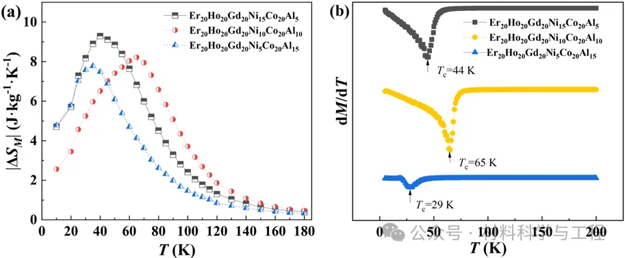 此外,通过高分辨率透射电镜(HRTEM)分析显示,Al含量为10% 的样品具有最低的结构有序度,进一步证实其最优的非晶形成能力(见图2)。在磁热性能方面,通过Al元素的添加诱导弱磁交换相互作用,可实现Er₂₀Ho₂₀Gd₂₀Ni₂₀-xCo₂₀Alx合金在29-65K的温度范围实现磁熵变的有效调控(如图3)。调控机制主要有以下三点:首先,Al的原子半径较大,用Al替代Ni会导致TM-TM与RE-RE原子间的距离增大。其次,在磁性体系中引入非磁性元素Al进一步产生稀释效应。