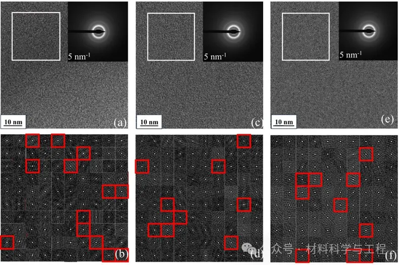 图2 Er20Ho20Gd20Ni20-xCo20Alx(x=5、10、15)非晶合金条带HRTEM图(a,c,e)及选区二维自相关处理图(b,d,f)。插图为选区电子衍射图。