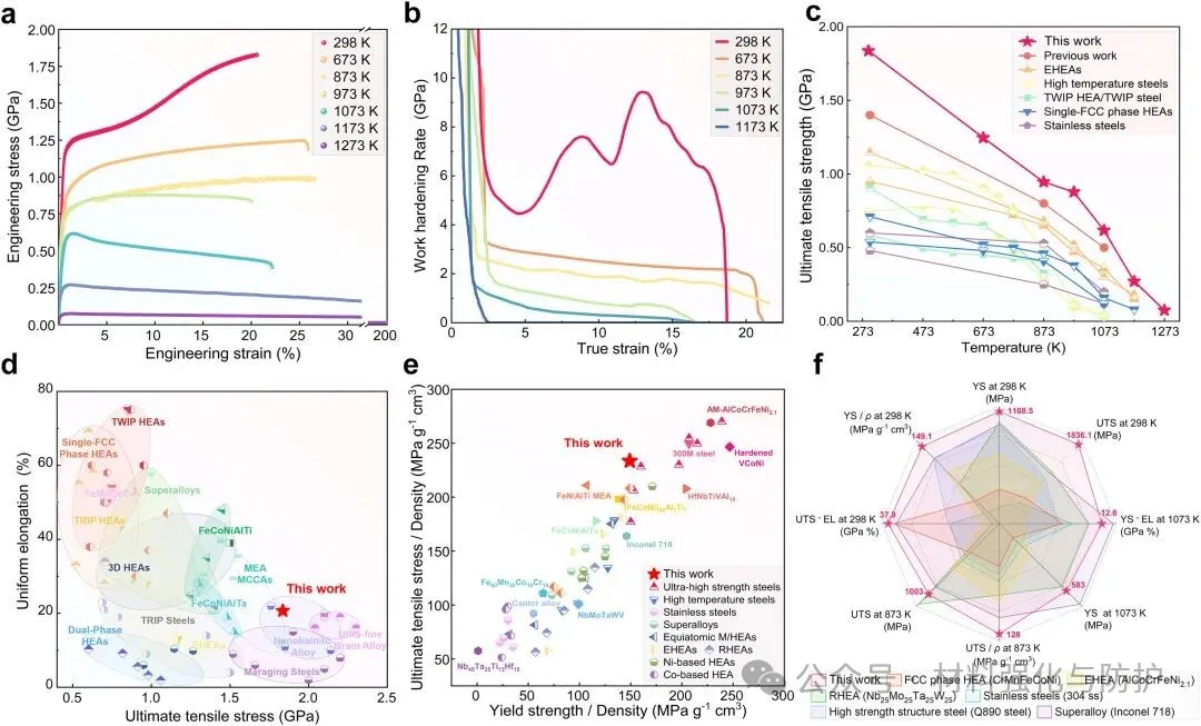 团队通过在单一合金体系中引入LCO短程有序结构、L12析出相、B2化合物及TaBC陶瓷颗粒,实现了从室温到1073 K的全温区高性能表现,该策略在传统合金和其他高熵合金中具有适用的可推广性,未来,这一思路有望应用于极端载荷环境下的关键构件制造。