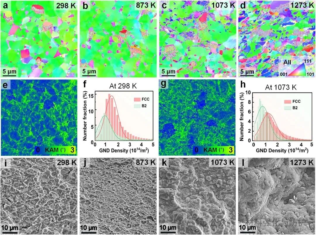 FCC基体内均匀分布的大量L12型Ni3Al纳米析出相(直径约10nm),L12纳米沉淀物与FCC基体之间的共格界面有效地减小了合金内部的应力集中,同时提供了大量的析出强化,位错与析出物之间的相互作用机制及其转变是抗高温软化的关键因素——较小的纳米沉淀物容易被位错剪切,而较大的纳米沉淀物阻碍位错运动,从而诱导Orowan机制。此外,TaBC颗粒与B2相在晶界处形成稳固的界面结合,抑制晶界滑移与氧扩散导致的脆化,使合金断口形貌在高温下仍呈现深窝状韧性断裂。