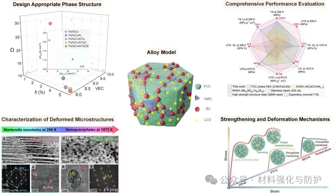 团队设计出一种能够将高熵固溶强化、金属间化合物强化、短程有序结构强化以及陶瓷颗粒弥散强化四种机制有机结合的Fe-28.2Ni-17Co-11Al2.5Ta-0.5C-0.04B(FeNi CoAlTaCB)合金。该合金具有独特的多层次微观组织,具体特征表现为在FCC基体上分布有短程有序(LCO)结构、金属间化合物(B2析出物)以及多元碳化硼(TaBC)的多尺度结构,从而使合金在1073K下保持超越多数高温钢与传统HEAs的强塑组合——583MPa的屈服强度+21.6%的延伸率。
