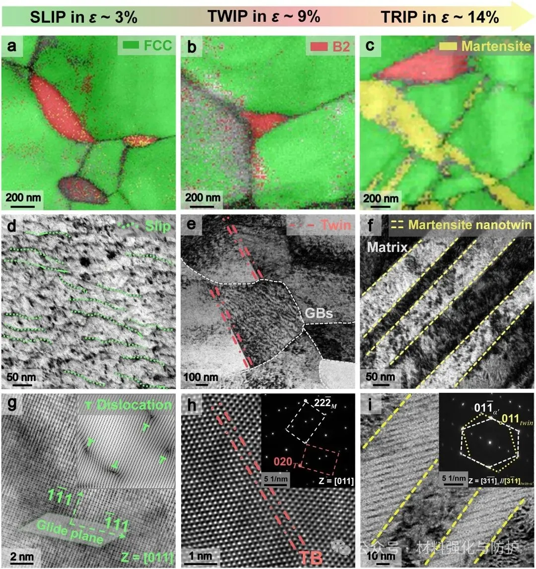 在室温变形条件下,该合金依次经历位错滑移→孪晶形核→应变诱导马氏体相变(TRIP)的序列性强化过程。位错滑移在初期提供合金的塑性来源,随后,低堆垛层错能(~60mJ/m²)促进孪晶形成(TWIP),显著提升加工硬化能力,最后,FCC基体中诱发的马氏体(BCC-α′)相变进一步提高强度,最终实现高强-高塑协同。