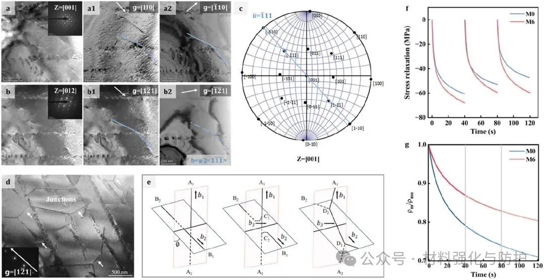 在调幅分解结构调控下,位错在相界附近发生频繁的交互、合并与缠结,最终形成位错结结构,这类位错结具有较高的能量壁垒,需要更大外加应力才能被解锁,从而直接提高了应变硬化能力。同时,M6中可动位错在变形过程中能够持续保留,并未因过度缠结而被过早耗尽,这一现象说明,调幅分解结构不仅能阻碍位错(提供强化),还能调控位错形态与相互作用模式(提供延展性维持),形成了一个可持续增强的塑性调控回路。