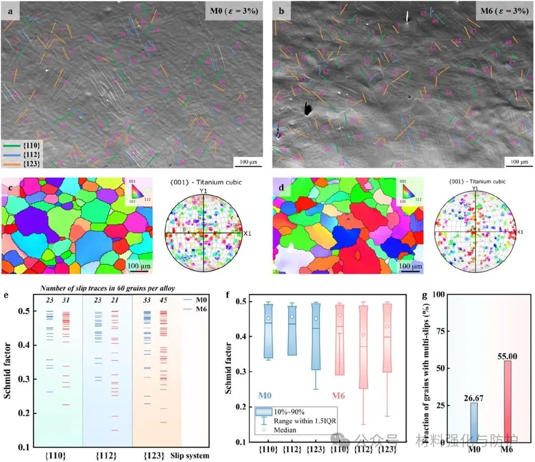 在塑性变形早期,M6合金中激活的滑移体系数量明显多于M0,尤其是{110}、{112}和{123}滑移面组合的共同参与,其中,{123}滑移的高频出现表明位错发生了显著的交滑移行为,而相界处的成分调制区域正是交滑移的重要诱发因素。多滑移体系的激活使得材料能够以更加分散、均匀的方式承担塑性应变,有效延缓局部化滑移带的形成,从而保持了较高的应变硬化速率,这意味着材料可以在更大应变量范围内保持均匀变形,不会过早进入颈缩阶段。