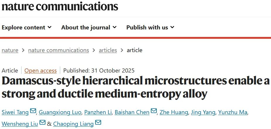 2025年10月31日,中南大学的研究团队在Nature子刊《Nature Communications》在线发表了一篇题为“Damascus-style hierarchical microstructures enable a strong and ductile mediumentropy alloy”的研究论文,团队从大马士革上得到了启发,将“类大马士革钢”结构引入中熵合金体系中,通过热力学驱动的相分解与原子尺度化学短程有序的多级结构调控,实现了强度与延展性的同时提升。通讯作者为中南大学的唐思危副教授、陈柏杉老师、刘文胜教授和梁超平教授。