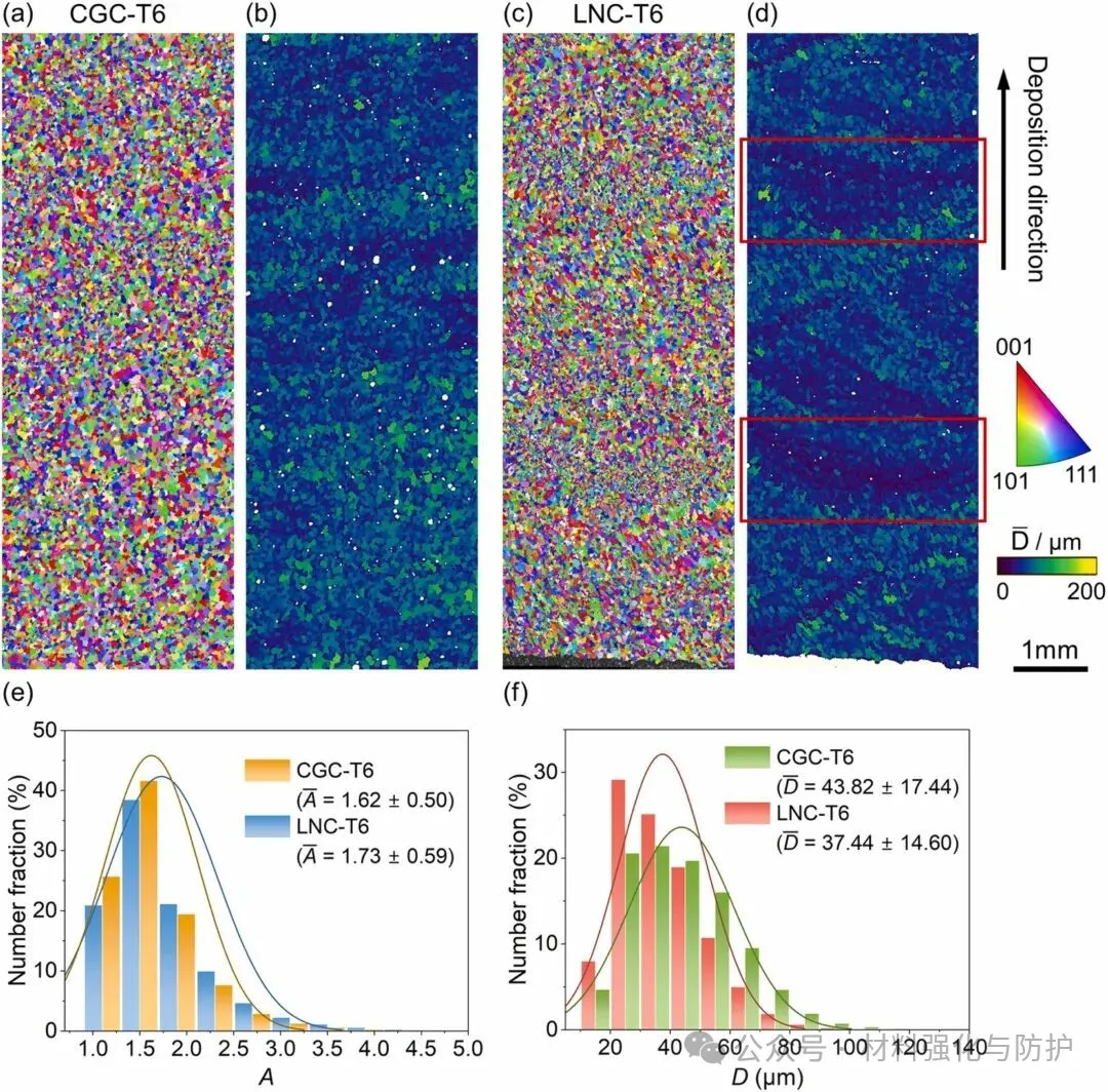 团队在Arc-DED枪头后部引入可控液氮喷流,使熔池在沉积过程中实现更高的冷却速率与更低的峰值过热温度。由于冷场紧随熔池移动,因此材料在不同的凝固位置均减少了因热累积导致的组织粗化和元素偏析,结合后续统一的T6热处理,这一工艺方案可以在不改变冶金体系的前提下有效调控沉积凝固条件,对照组为没有使用液氮冷却的工艺路线,命名为CGC-T6。