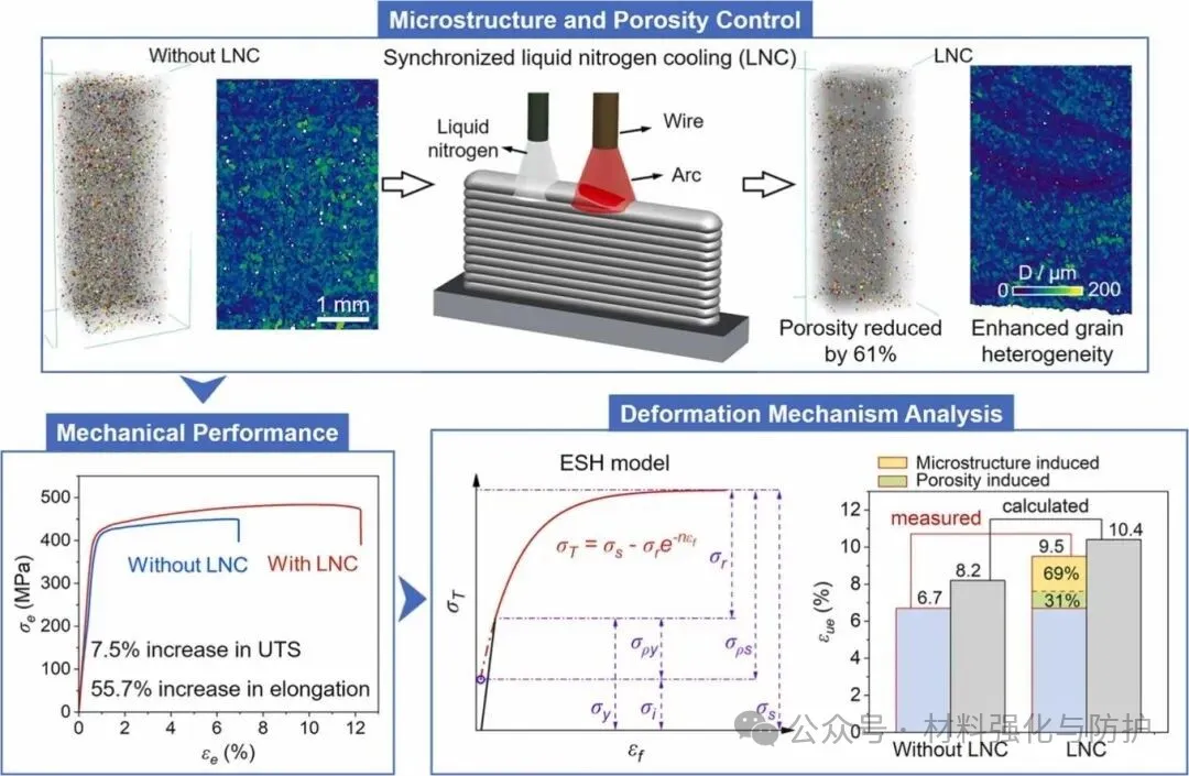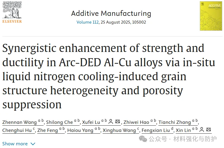 近期,增材制造领域的国际期刊《Additive Manufacturing》在线发表了一篇题为“Synergistic enhancement of strength and ductility in Arc-DED Al-Cu alloys via in-situ liquid nitrogen cooling-induced grain structure heterogeneity and porosity suppression”的研究成果,在本论文中团队提出了一种Arc-DED沉积过程同步液氮冷却(LNC)的策略,用以解决铝铜合金增材制造中“强度难提升、延展性低、气孔易形成”的长期瓶颈问题。团队的研究表明,该策略可在不增加额外后处理步骤的前提下,实现沉积组织结构与孔隙状态的双重优化,使材料在T6热处理后同时获得482.1MPa的抗拉强度与10.9%的延展性,表现出显著的强-延协同效应。通讯作者为西北工业大学凝固技术全国重点实验室的鹿旭飞教授和林鑫教授。