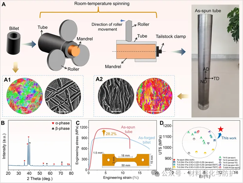在该工作中,成功地在室温下旋压出了壁厚均匀、表面粗糙度好的Ti-3Al-4Mo-4V1Nb-1SN合金管材,并全面研究了合金的室温可旋压性,揭示其内在机理,并研究了其组织演变和强塑性协同效应,研究结果证明团队提出的室温旋压钛合金在改善拉伸性能和降低生产成本方面显示出显著的优势。