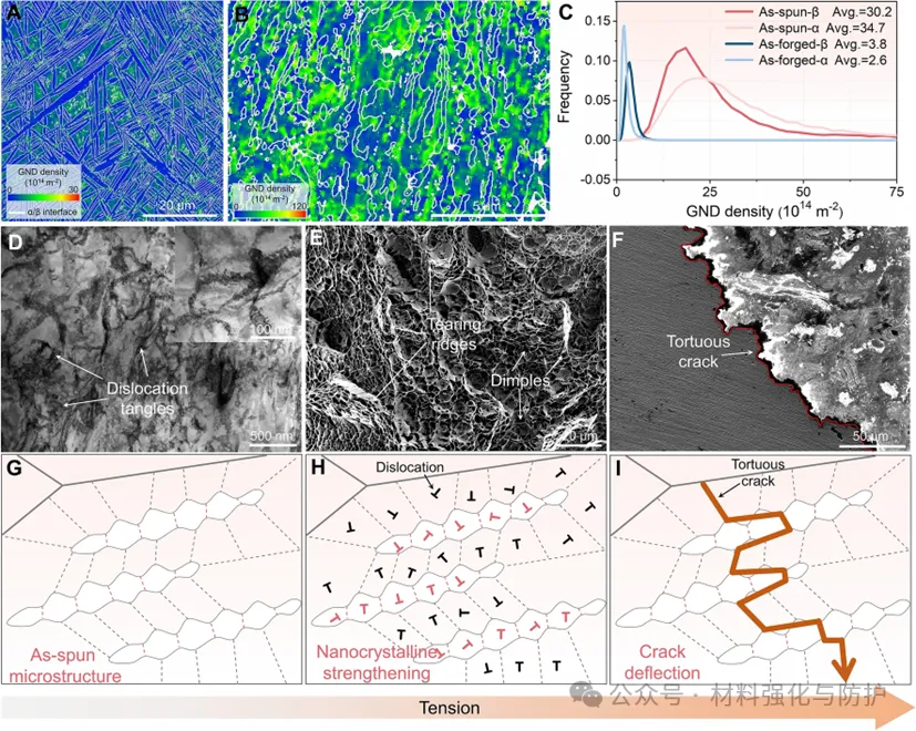 ·强度方面,旋压后合金内的几何必要位错(GND)密度提高一个数量级,高密度的GND在旋压过程中诱发合金的加工硬化效应,对最终合金的强度提高起主要的贡献作用;塑性方面,纳米晶粒和α/β界面的模量失配能够有效阻碍位错运动,同时棱柱面滑移被激活,协同之下合金依旧具有与强度适配的延展性。
