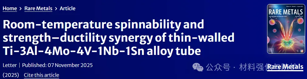 上海交通大学团队于2025年11月8日在《Rare Metals》期刊上发表了题为“Room-temperature spinnability and strength-ductility synergy of thin-walled Ti-3Al-4Mo-4V-1Nb-1Sn alloy tube”的研究论文。团队在该论文的中阐述了他们在室温下旋压Ti-3Al-4Mo-4V-1Nb-1Sn合金薄壁管,屈服强度达到965±14 MPa,抗拉强度达到1149±20 MPa,延伸率为11.3%±0.3%,实现了高强度和高延展性的优异协同,这种性能组合通过微观结构调控和位错工程实现,为钛合金的室温加工提供了新思路,在航空航天和军事工业中具有广泛应用前景。通讯作者为上海交通大学的王锋华副研究员和韩远飞研究员。