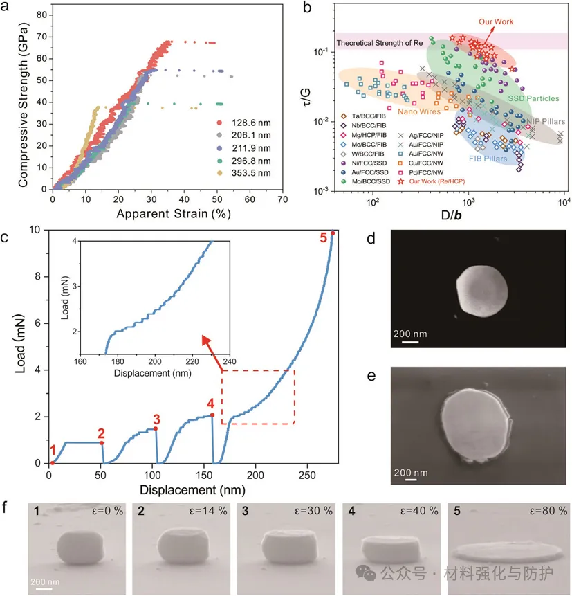 在原位SEM压缩实验中,单晶Re纳米颗粒表现出远超传统金属体系的强度,尺寸约为128 nm的颗粒,其压缩强度高达67.8 GPa,已接近Frenkel模型预测的理论强度上限,这一强度值不仅远高于先进结构材料,甚至超过纳米金刚石等体系,真正意义上刷新了金属强度天花板。更为重要的是,单晶铼纳米颗粒在压缩时并未像常规高强材料那样发生脆性断裂,颗粒逐渐被压扁成“薄饼形”结构,但并未出现裂纹或崩解,在承受高应力加载后仍可实现约80%的可恢复塑性变形,表现出极高延展性与构形保持能力。