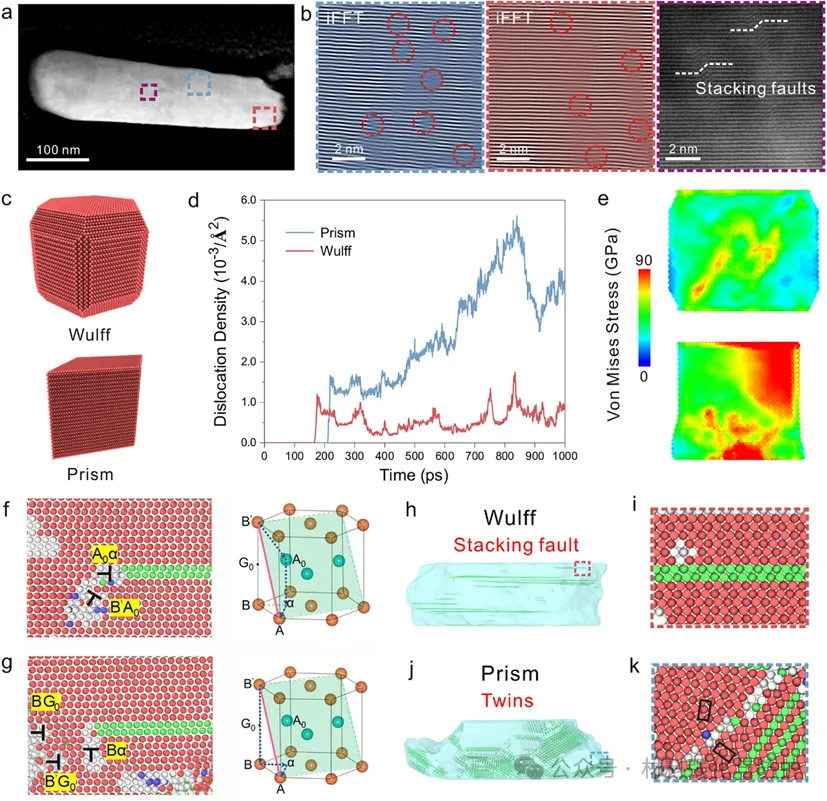 团队结合原子级STEM表征与分子动力学模拟,对变形后结构进行了机制解析,变形后结构内部未观察到晶界迁移或孪晶形成,而是以位错产生、滑移和向表面逸出为主要塑性机制,这一过程避免了位错堆积引发的应力集中,从而消除了常见的脆性断裂模式,模拟结果显示,高对称Wulff形貌能够使应力在颗粒内部均匀分布,显著降低局部破坏风险;若将颗粒形貌替换为低对称柱体,则应力集中导致快速失稳断裂。