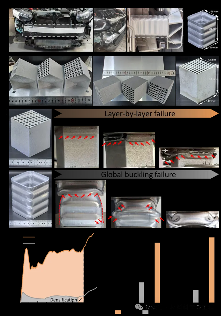 为验证其工程适用性,研究团队以汽车吸能盒为原型,1:1打印出150×85×162 mm³的超材料构件。与商用6061铝合金吸能盒相比,该构件比能量吸收提升194.7%,屈服强度提升411.6%,展现出显著的性能优势。
