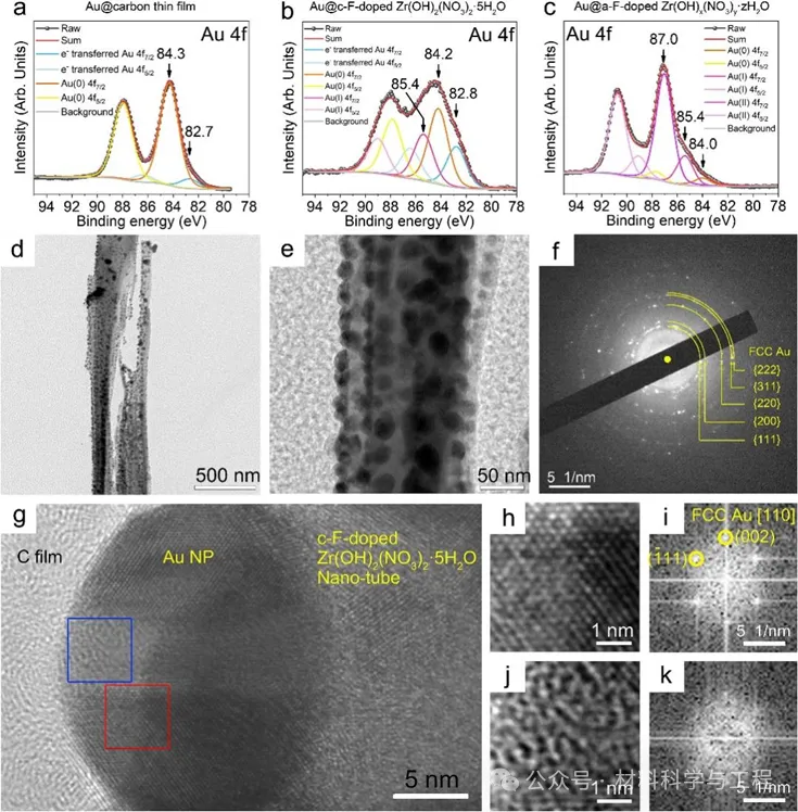 图1 Zr(OH)2(NO3)2·5H2O锆氢氧化物硝酸盐微纳米管的表征。 图2 Zr(OH)2(NO3)2·5H2O锆氢氧化物硝酸盐微纳米管表面金纳米颗粒的电子自转移。 图3 200KeV电子辐照下金纳米颗粒内BCC金的形成。 图4 BCC金的形成机制。
