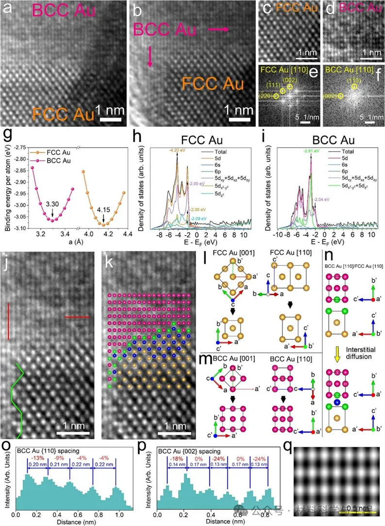 在常温常压条件下,元素周期表中的大多数金属元素会形成相对致密、热力学更稳定的体心立方(BCC)、面心立方(FCC)和密排六方(HCP)三种晶体结构之一 [1]。对于纯金属而言,通过调整温度场或应力应变场,可能使部分族元素形成上述三种不同结构,甚至其他衍生结构。举例来说,通过常压温度调节可以使钛族元素(钛Ti、锆 Zr 和铪 Hf)形成上述三种结构,当施压超过2 GPa时,Ti和Hf还会形成ω相,一种BCC结构的畸变衍生相。相比之下,铜族元素(铜 Cu、银 Ag 和金 Au)在常压下仅呈现FCC结构,即使温度升高至其各自的熔点也不会发生结构转变,在室温下,缓慢加压数百 GPa仍具有高度稳定性。 近年,在压力介于225至298 GPa之间的冲击波压缩实验中,首次通过原位X射线衍射(XRD)检测到BCC金[1]。此外,当对金纳米晶体施加拉伸力时,在晶体颈缩过程中或断裂后也观察到了局部的BCC结构[2,3]。除了BCC金之外,在银丝的弯曲过程中,为了适应压缩区域的应变,也在FCC-BCC-HCP-FCC相变路径中观察到了银的BCC瞬态结构[5]。值得注意的是,电场也对bcc结构转变产生影响,文献4介绍了在电子辐照过程中,FCC结构的金薄膜中形成了纳米尺度的BCC金结构,但在进一步辐照后转变为非晶态。 中国科学院金属研究所李阁平研究员课题组首次成功合成了氟离子掺杂、沿[001]方向生长的Zr(OH)2(NO3)2·5H2O锆氢氧化物硝酸盐微纳米管,通过物理溅射沉积法在微纳米管表面制备出分散排列的金纳米颗粒,光照下产生较强的表面等离子体,通过透射电子显微镜(TEM)观察金纳米颗粒发现,在200keV电子辐照下,非晶金和部分FCC金转变为BCC金,且在持续辐照下稳定存在。BCC金结构由高分辨TEM图像分析,DFT计算和高分辨TEM图像模拟综合确定。 另外,从非晶金中形成的BCC金与FCC金形成了热力学更稳定的{110}BCC Au‖{100}FCC Au共格界面。X射线光电子能谱(XPS)分析发现,微纳米管表面的金纳米颗粒内部发现了电子自转移,形成了正一价和负一价金。DFT计算表明微纳米管表面负离子与金纳米颗粒接触,该界面电场诱发了上述电子自转移。该课题组提出,这种电子转移提高了金原子的电子云密度,电子云与金离子核的库伦吸引作用更强,增强了金属键合强度,具有相对更小晶面间距的BCC金表现出更高的热力学稳定性。 本质上,BCC金周期结构的第一布里渊区内费米球可以容纳更高密度的电子态,因此,BCC金是带负电荷金的晶体结构选择。在电子辐照过程中,电子束的电子与金纳米颗粒中金原子发生散射,转移部分动量给金原子,使其可以发生晶格位移和扩散,诱发相变。正空间FCC-BCC转变,导致费米面fcc-bcc转变,由此引起能带对称的取向,电子云密度的变化,将对铜族元素与半导体接触的电子行为产生结构性影响。通过异质结构设计和界面电荷调控可以稳定非本征晶体结构,拓宽了金属元素在室温的结构选择,为金属纳米材料的结构调控和性能探索与优化提供了新的思路,为金属键合理论提供了全新认识。 该研究第一作者顾恒飞博士,于2015年硕士毕业于中国科学院金属研究所,2022年于美国罗格斯大学化学与生物化学系取得博士学位,现为普林斯顿大学博士后,并于2025年获提名为美国Sigma Xi科学研究荣誉学会的正式会员。该研究通讯作者为李阁平研究员。相关研究结果以题为“Increasing atomic electron cloud density enabled by heterostructure interfacial charge transfer leads to formation of body centered cubic (BCC) gold at room temperature”发表于Applied Surface Science。