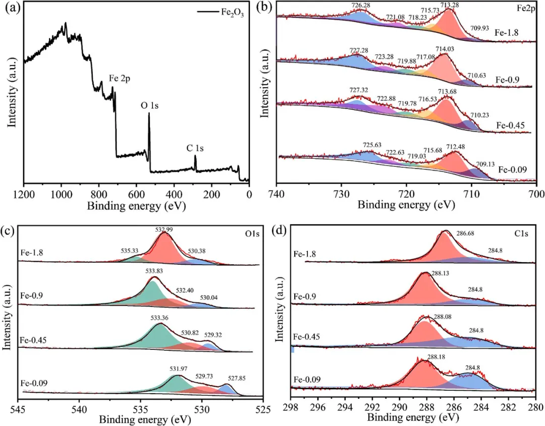 图1 XRD(a)前驱体,(b)Fe2O3(c)在32-34º范围内局部放大图。 图2 (a)C-0.09、(b)C-0.27、(c)C-0.45、(d)C-0.9、(e)C-1.35和(f)C-1.8的SEM图像。 图3 (a)Fe-0.09、(b)Fe-0.27、(c)Fe-0.45、(d)Fe-0.91、(e)Fe-1.35和(f)Fe-1.8的SEM图像。 图4 XPS谱图:(a)全谱,(b)Fe2p,(c)O1s,(d)C1s。 图5 空心Fe2O3机理示意图。 4. 小结 综上所述,通过调节反应体系中的葡萄糖浓度,可以精确控制Fe2O3结构的形成过程和最终形貌:在低浓度(<0.45M)下,形成纳米颗粒,在中等浓度下,动态平衡机制促进碳层均匀包裹核心并自组装成规则的微球结构;而在过高浓度(>0.45M)时,由于碳层的过度生长,结构变得不稳定。在反应过程中,葡萄糖氧化产生的有机酸与Fe3+或Fe2+(Fe3+还原)结合形成金属有机中间相,该中间相的热力学演化最终产生Fe2O3。Fe-0.45的最终形貌光滑圆润,平均粒径为2.88μm,平均孔径为20.3nm,比表面积为20.1m2/g。 数据来源与出处 相关研究成果以“Hydrothermal synthesis of hollow Fe2O3 microspheres: effect and mechanism of glucose concentration”为题,发表在《Materials Science & Engineering B》上。