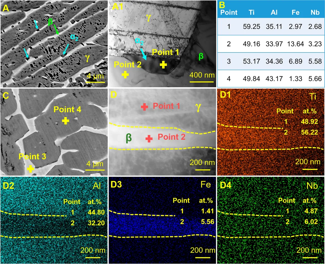 本研究采用Ti-46Al-2.8Fe-xNb(4-6 at.%)合金体系,通过电弧熔炼与多次重熔获得成分均匀的(β+γ)全层片组织,并以Nb含量作为主要调控变量。研究团队利用SEM/EDS分析相组成与层片结构,结合TEM/HRTEM与SAED观察位错、层错和孪晶的形成,同时借助 GPA表征界面应力场,并通过XRD评估堆垛层错能变化。随后,通过室温压缩与750 ℃拉伸实验系统评估Nb对强度与塑性的影响,从而构建成分调控—微结构演化—力学性能提升的完整关联机制。