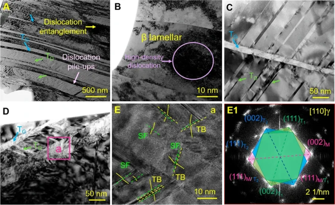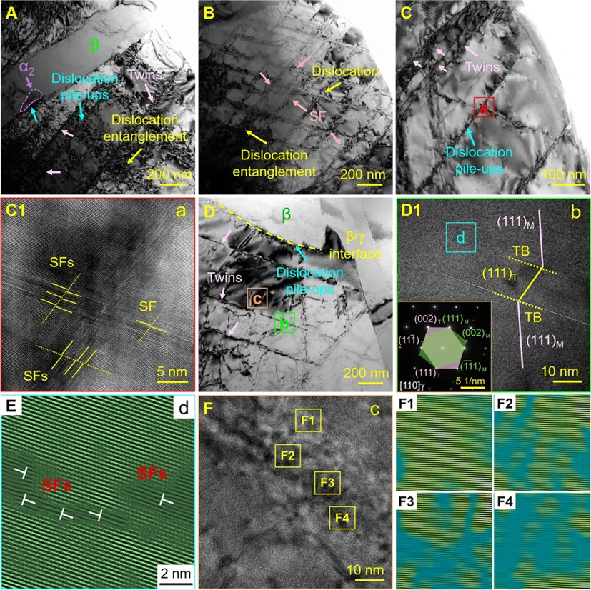 界面内高密度位错的存在是层错与孪晶产生的直接诱因。当应力作用持续增强,位错在界面附近不断滑移、分裂并转化为层错,这些层错又进一步诱发孪晶胞的形成,使孪晶从界面向γ层片内部扩展。因此,β/α2界面是整个“纳米孪晶网络”发育的起点和驱动中心,是本研究中最关键的微结构控制对象。