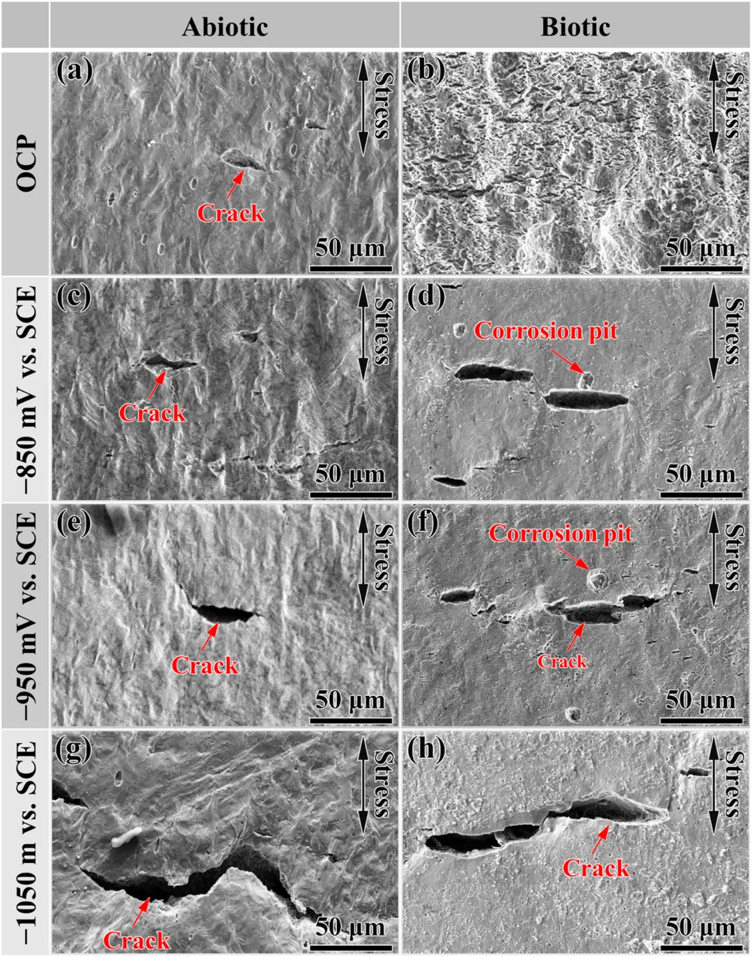 焊缝金属表面最先出现生物膜诱导的点蚀坑,在SRB持续代谢产生的硫化物及局部酸化作用下,这些点蚀逐渐发展成更深的孔蚀,随着阴极保护电位的进一步降低,表面氢原子生成量显著增加并进入金属内部,使得孔蚀底部局部应力集中加剧,当外加载荷作用叠加时,孔蚀区便成为裂纹萌生的高危区域,裂纹随后沿晶界或穿晶路径快速扩展。