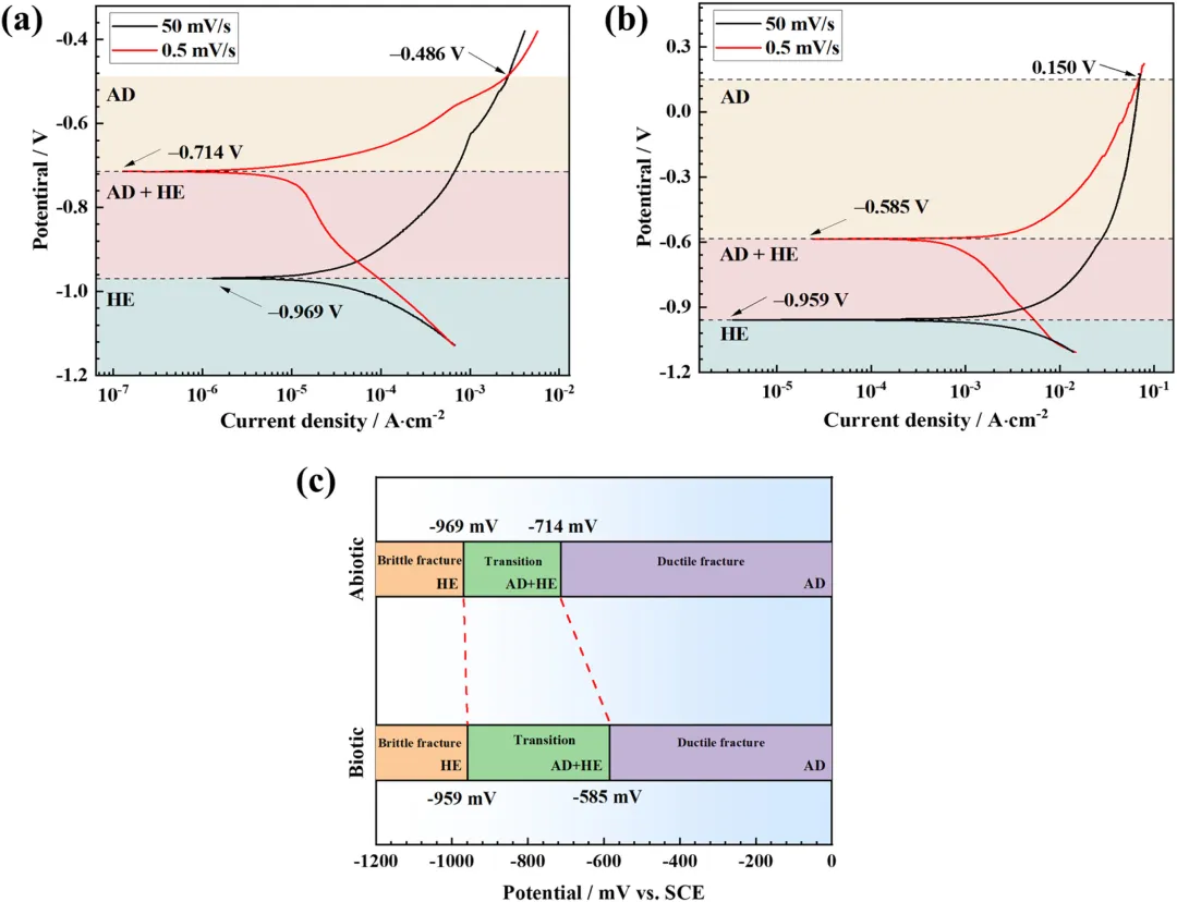 在这项研究中,团队通过构建含SRB的腐蚀体系并结合不同阴极保护电位,对X80焊接接头的腐蚀与开裂过程进行了系统追踪,研究发现SRB生物膜会在焊缝金属表面快速诱导点蚀,而过度的阴极保护产生的大量氢原子进一步在孔蚀底部聚集,使局部成为裂纹最易萌生的位置。其中,热影响区由于组织不均匀及残余拉应力集中,更容易在SRB与氢共同作用下提前出现裂纹,并表现出由韧性向脆性断裂的转变。