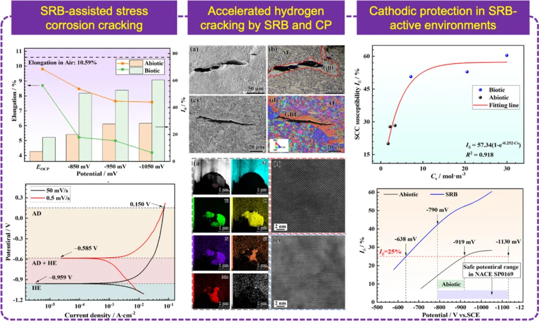 2025年11月9日,材料领域国际期刊《Acta Materialia》在线发表了题为“Microbiologically assisted stress corrosion cracking of X80 pipeline steel welded joint under cathodic protection”的研究论文,全面研究了X80管线钢焊接接头在SRB活性环境中不同阴极保护(CP)电位下的SCC行为,阐明了SRB和CP在SCC引发和扩展中的协同作用。通讯作者为湘潭大学吴堂清教授。