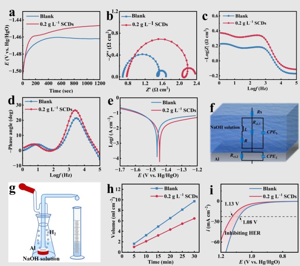 01 全文速览 本研究由北京科技大学、北京理工大学、新加坡国立大学联合完成。科研团队创新性地将槐叶衍生碳量子点(SCDs)引入碱性铝空气电池电解液中,实现了电极界面调控与腐蚀抑制的协同优化。SCDs在铝表面形成稳定的平行吸附膜,有效抑制自腐蚀与析氢副反应,使电池比容量提升至 1538.5 mAh g⁻¹、能量密度达 1800 Wh kg⁻¹。该研究为绿色生物质功能材料在金属空气电池中的高效应用提供了新思路。 02 研究背景 铝空气电池(Al–air battery, AAB)因其高比能量、铝资源丰富、环境友好等优势,被认为是最具潜力的下一代储能体系之一。然而,电池在碱性电解液中运行时,阳极铝会发生自腐蚀和析氢副反应,导致放电效率下降、能量浪费严重,成为限制其商业化应用的关键瓶颈。 针对这一问题,科研界已提出多种缓解策略,包括阳极合金化改性、防护涂层构建、油驱体系设计以及电解液优化等方法。前几种方案虽能在一定程度上提升电极稳定性,但往往面临制备工艺复杂、成本高、体系兼容性差等局限。相较之下,电解液添加剂法因其操作简便、成本低、易调控等优势,成为当前研究的热点方向。 然而,现有电解液添加剂仍存在多重不足: 一是高效性依赖于高浓度添加,容易导致电导率下降、极化加剧等副作用; 二是多数有机分子或无机盐添加剂存在环境友好性差、可再生性低的问题,与绿色储能理念相悖; 三是在强碱体系中,传统有机添加剂易发生分解或吸附不稳,导致缓蚀效果随时间衰减; 四是缺乏对分子层面界面调控机制的深入理解,使得添加剂设计仍以经验为主。 因此,亟需开发一种兼具高效缓蚀、结构可调、环境友好的新型添加剂,实现对铝空气电池阳极/电解液界面的精确调控,为实现高能量密度与长寿命并存的绿色电池体系奠定基础。 03 本文亮点 (1)绿色原料、低成本制备:以自然可再生的槐叶为碳源,不仅降低了制备成本,还赋予材料优异的环境友好性和可持续性,契合“双碳”战略背景。 (2)多官能团协同吸附机制:SCDs富含C、O、N、S等异质原子官能团,能在铝表面形成稳定的平行吸附膜;通过Al–O、Al–S配位作用实现界面致密化,有效阻断阳极溶解与析氢副反应。 (3)性能显著提升:在仅0.2 g·L⁻¹的低浓度下,SCDs即可实现41.5%的缓蚀效率与1.5–1.9倍的阳极寿命延长;同时比容量提升至1538.5 mAh·g⁻¹、能量密度达到1800 Wh·kg⁻¹,远超未添加体系。 (4)实验—理论协同揭示机理:结合电化学测试、表面谱学分析与密度泛函理论(DFT)计算,系统揭示了SCDs在Al(111)晶面上平行吸附—电子重分布—界面钝化的多尺度作用机制,为未来电解液添加剂的分子设计提供了新范式。 04 图文解析 图1. SCDs的制备与表征。(a) SCDs的制备流程示意图;(b) 原子力显微镜(AFM)图像;(c) 透射电子显微镜(TEM)图像;(d) TEM图像的粒径分布分析;(e) 傅里叶变换红外光谱(FTIR);(f)–(i) X 射线光电子能谱(XPS)图谱。 图2. SCDs对电解液性能的调控作用。(a) 开路电位(OCP)曲线;(b) Nyquist 阻抗图;(c)–(d) Bode 图;(e) 动电位极化曲线;(f) 电化学阻抗谱的等效电路拟合模型;(g) 析氢测试装置示意图。(h) 析氢实验结果;(i) 电化学稳定性测试结果。 图3. SCDs 对铝空气电池(AABs)放电性能的影响。(a) 铝空气电池的结构示意图;(b) 实验装置实物照片;(c) 红外热成像图;(d) 极化曲线及对应的功率密度图;(e) 阶梯放电曲线;(f) 间歇放电曲线;(g) 极限放电曲线;(h) 比容量变化曲线;(i) 性能对比图;(j) 铝空气电池驱动电子设备的实物照片。 图4. SCDs 对铝空气电池优化机理示意图。(a) 优化后的吸附结构:上图为侧视图,下图为俯视图;(b) SCDs/Al(111) 体系的Z方向与三维差分电荷密度分布图;(c) 电子局域函数(ELF)分布;(d) SCD/Al(111) 的态密度(DOS)图;(e) 作用机理示意图。 05 总结与展望 本研究创新性地提出了利用生物质碳量子点(SCDs)调控铝空气电池电极界面的新策略,首次实现了界面调控与缓蚀性能的协同优化。实验与理论结果表明,SCDs 分子可在铝表面形成稳定的平行吸附膜,通过Al–O / Al–S 配位与电子重分布,有效抑制阳极溶解和析氢反应,显著提升电池稳定性。在仅 0.2 g·L⁻¹ 的低浓度下,SCDs 即实现1.9 倍阳极寿命提升,并使能量密度达 1800 Wh·kg⁻¹。研究为绿色碳量子点材料在储能体系中的应用提供了新思路,也揭示了“绿色分子设计—界面吸附—性能响应”的内在关联。未来,该方法可拓展至锌空气电池、水系金属电池及燃料电池等体系,为构建高性能、长寿命的绿色储能器件提供可持续的发展路径。 06 作者介绍 强玉杰,北京科技大学国家材料服役安全科学中心(主任:庞晓露)副教授,新加坡国立大学访问学者。主要从事绿色缓蚀新材料、金属空气电池、水系金属电池等研究。32岁起入选“科睿唯安”全球高被引科学家,28岁起入选斯坦福大学全球前2%顶尖科学家,获中国科协青年人才托举工程、先进材料青年科学家出版工程及之江实验室国际青年人才。主持国家自然科学基金面上/青年基金、国家外专项目,20余项省部级和央企产学研攻关项目。累计发表SCI论文100余篇,第一/通讯作者SCI论文80余篇(18篇腐蚀顶刊Corrosion Science,6篇JMST,累计24篇ESI高被引论文),总被引超1.2万次,H因子53。公开15项中国、荷兰、美国等国家发明专利。荣获 “北京榜样”、“北京青年榜样”、《科学中国人》“年度科技新锐”。相继获中国腐蚀与防护学