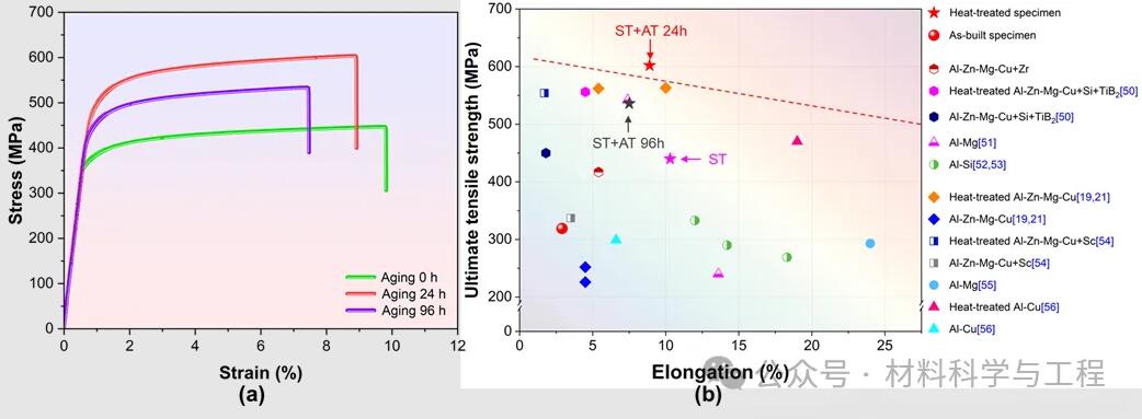 图4 (a)应力-应变曲线;(b)抗拉强度、断口伸长率与参考文献LPBF和WAAM成形Al-Si、Al-Cu、Al-Mg以及Al-Zn-Mg-Cu合金的比较