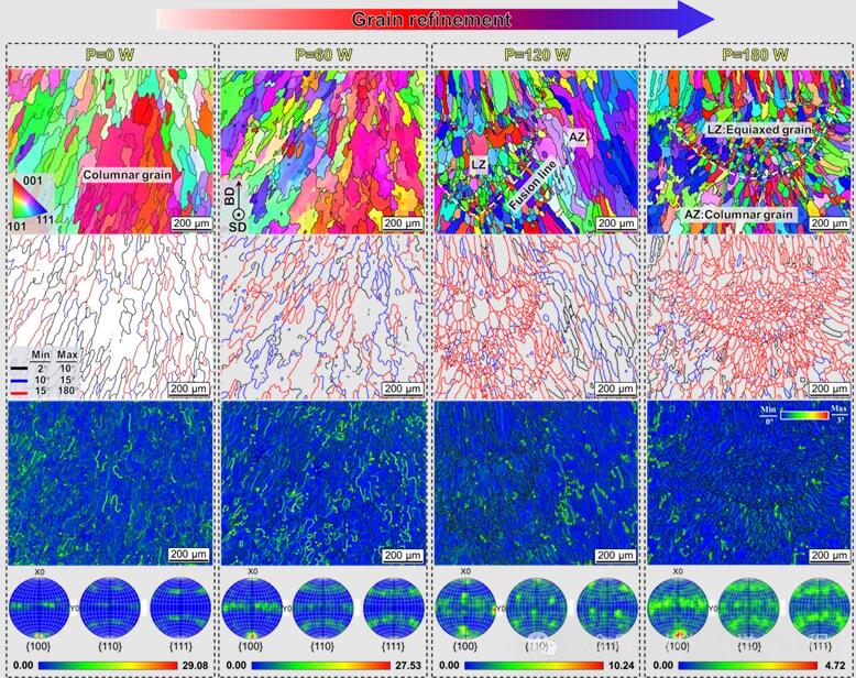 图2 不同激光功率下Al-Zn-Mg-Cu合金沉积样件的EBSD分析