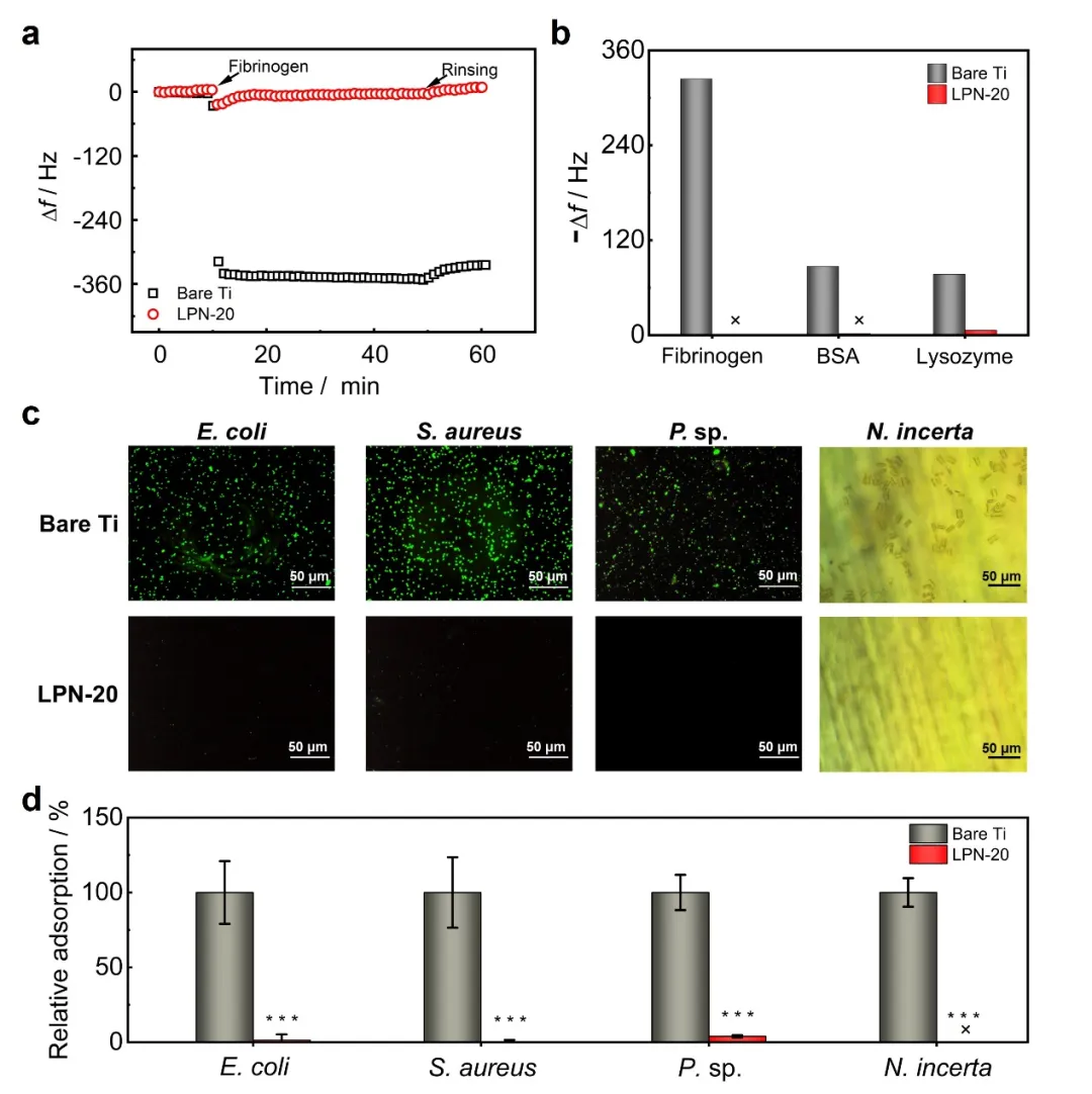 华南理工大学海洋工程材料团队长期从事海洋先进防护高分子材料研究,提出“动态表面防污”策略,研制了针对船体的可控降解高分子基防污材料(Acc. Chem. Res. 2022, 55, 1586)和螺旋桨的聚合物陶瓷防污材料(Prog. Polym. Sci. 2024, 154, 101840),相关技术已在船舶、海洋能源装备等规模化应用。近期,针对内海水系统防污需求,他们沿“动态表面防污”思路,研制了一种新型原位自构筑海洋防污涂层,该涂层由聚N-异丙基丙烯酰胺(PNIPAM)在钛合金表面原位自组装形成,可有效解决以往防污涂层在内海水系统难以涂装施工的难题。