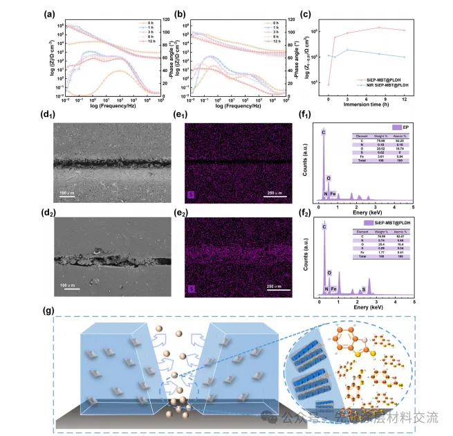 图6具有人工划痕的SiEP-MBT@PLDH浸入3.5%NaCl溶液中的EIS测试;(a)引入划痕后,和(B)在NIR下划痕修复后;(c)jZ j 0.01值;(dl)EP和(d2)SiEP-MBT@PLDH上划痕的SEM图像; S元素在(el)EP和(e2)SiEP-MBT@PLDH中的分布;(f1)EP和(f2)SiEP-MBT@PLDH的EDS元素组成;(g)SiEP-MBT@PLDH的自修复性质的机理图