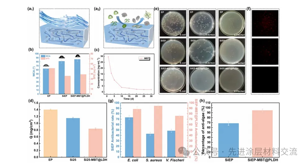 图4(a)SiEP-MBT@PLDH的疏水表面(a1)和微生物粘附抑制机制(a2)。(b)EP、SiEP和SiEP-MBT@PLDH的WCA和SFE。(c)MBT从SiEP-MBT@PLDH的释放曲线。(d)静态蛋白质吸附率。(e)粘附于EP、SiEP、SiEP和SiEP-MBT@PLDH的大肠杆菌、金黄色葡萄球菌和费氏弧菌的殖民地生长的数字图像。和SiEP-MBT@PLDH。(f)三角褐指藻的倒置荧光显微镜图像。(g)EP、SiEP和SiEP-MBT@PLDH的抗菌率和(h)抗藻率
