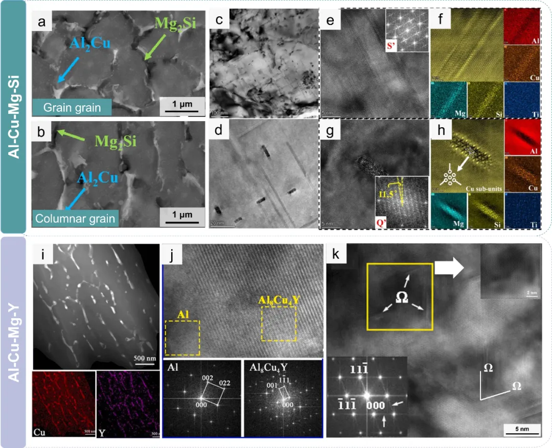 Al-Cu系:添加Sc、Zr形成L1₂-Al₃(Sc,Zr)相,既能细化晶粒(从柱状晶变为等轴晶),又能抑制裂纹。团队提到一款Al-Cu-Mg-Si-Ti合金,打印态屈服强度达473 MPa,250℃下仍能保持150 MPa;