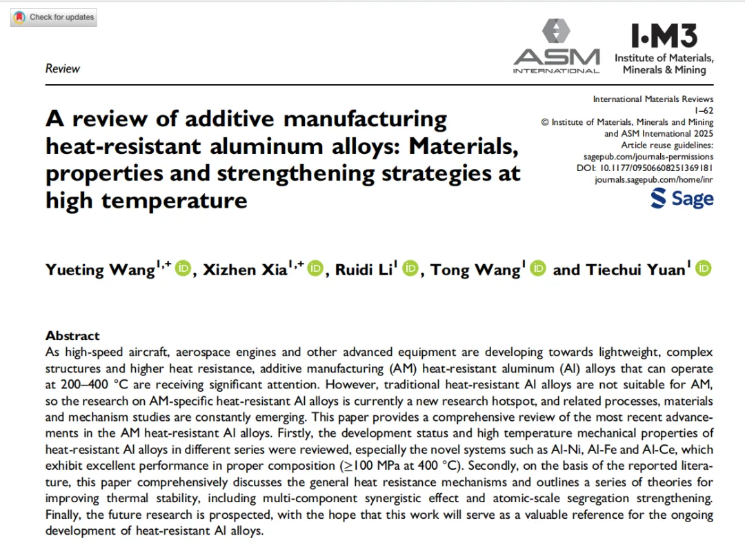 工程领域TOP综述期刊International Materials Reviews发表了题为“A review of additive manufacturing heat-resistant aluminum alloys: Materials, properties and strengthening strategies at high temperature”的系统综述。全文近3万字,38图,15表,对增材制造耐热铝合金的进展进行了系统全面的总结,中南大学王悦婷、夏熙珍为第一作者,李瑞迪教授为通讯作者。该论文回顾了不同系列耐热铝合金的发展现状和高温力学性能,并全面讨论了耐热机理,概述了一系列提高热稳定性的方法,旨在针对目前增材制造耐热铝合金的研究进展提供一个客观和深入的评价,并对AM高性能耐热铝合金的发展前景和机遇进行展望。