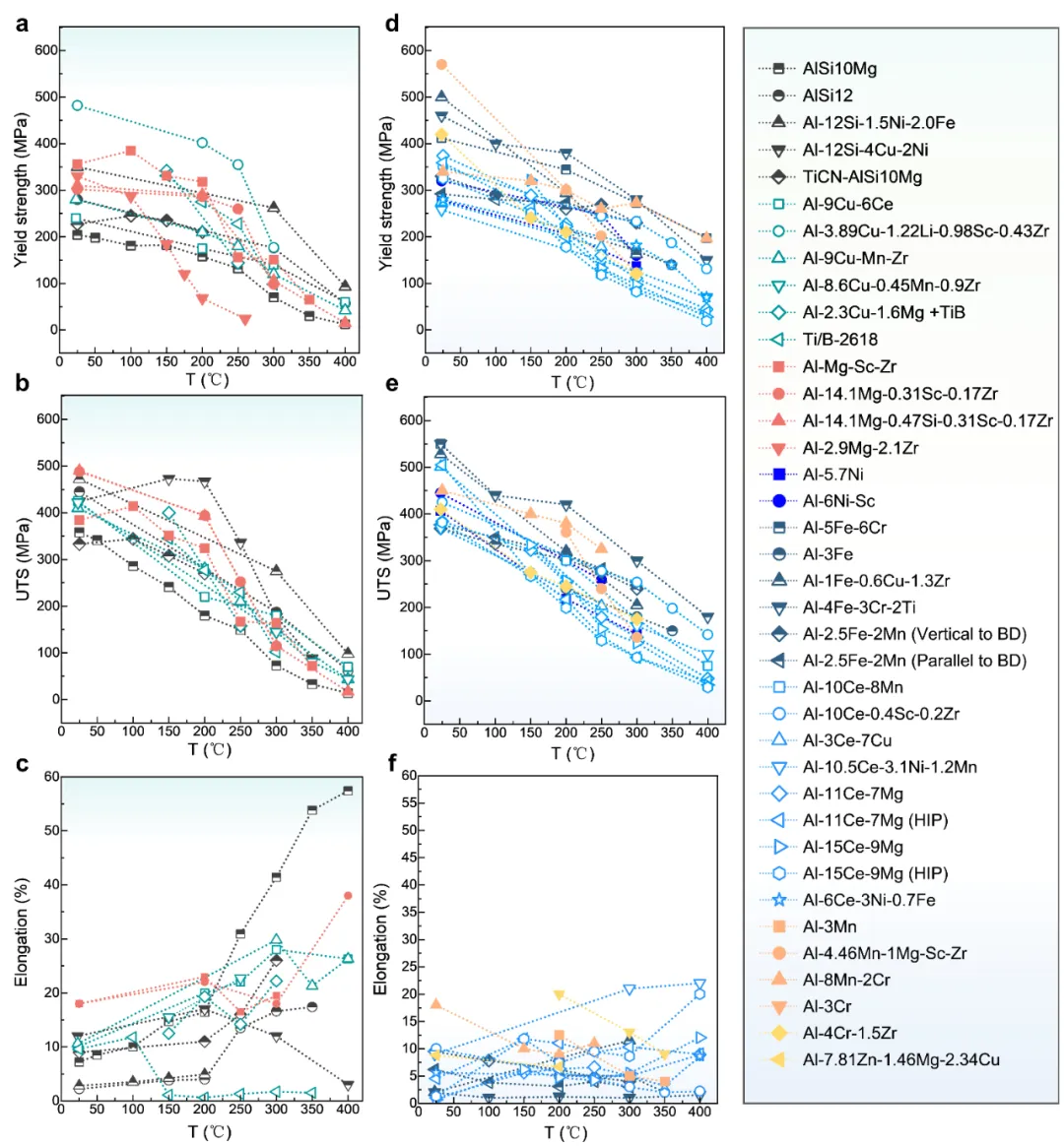 随着航天器、航空发动机等高端设备的快速发展,对具有优异高温性能的金属材料需求日益增长。这类材料需要具备“高强度、轻量化和卓越高温性能”三大特性。虽然能够承受600℃以上高温的镍基高温合金仍占主流,但市场对200-400范围(图1)的材料需求持续攀升。尽管钛合金能满足这一温度要求,但采用铝(Al)合金(密度2.7g/cm³)替代钛合金(密度4.05g/cm³)可实现约40%的减重效果,这展现出显著的轻量化优势。因此,耐高温铝合金的研发不仅有助于降低材料成本,更能推动设备轻量化进程。目前铸造、锻造和挤压仍是铝合金加工的主要工艺。然而,现代工业对复杂几何形状轻量化部件的需求不断增长,给传统加工工艺带来了严峻挑战。增材制造(AM)技术凭借其独特的逐层成型能力,实现了几何结构复杂部件的一体化制造。该技术能成功制备蜂窝结构、薄壁结构及空心部件等复杂轻量化结构。此外,增材制造技术固有的快速凝固特性能够形成超细晶粒微观结构,从而显著提升耐热铝合金的性能。在众多增材制造技术中,粉末床熔融激光束(PBF-LB)是最广泛应用的方法。由于其极高的凝固速率(约10⁷K/s),PBF-LB能进一步细化微观结构并促进高浓度强化相的析出。这一特性为提升耐热铝合金的机械性能提供了新机遇。通过打印耐热铝合金,零件可同时实现卓越的复杂结构和耐热性能。因此,增材制造用耐热铝合金已成为材料科学领域的重大研究前沿和重点攻关方向。