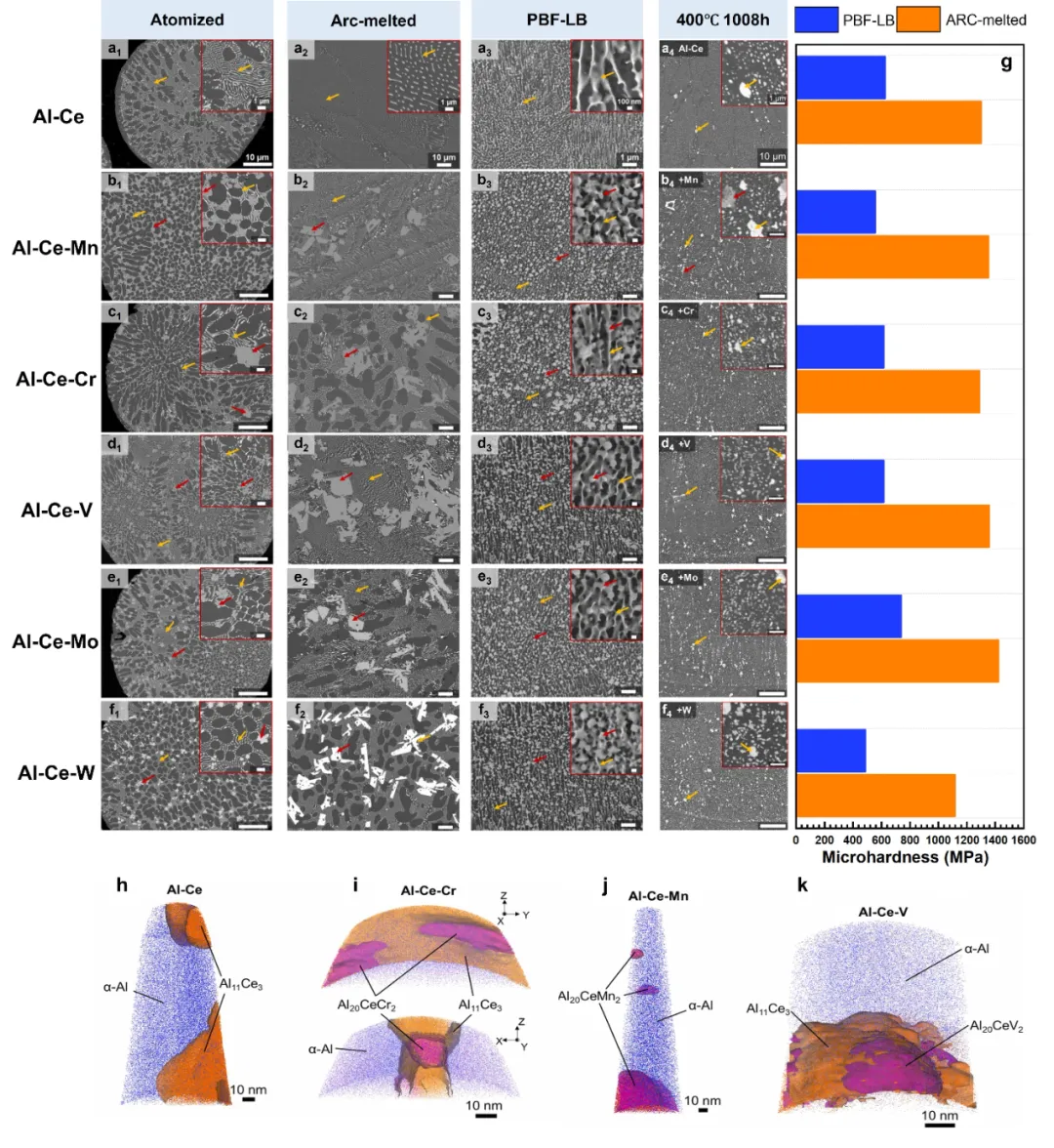 图14、SEM显微照片展示了不同处理条件下的共晶显微组织:(a) Al-Ce合金,(b) Al-Ce-Mn合金,(c) Al-Ce-Cr合金,(d) Al-Ce-V合金,(e) Al-Ce-Mo合金,(f) Al-Ce-W合金。实验条件包括雾化处理、电弧熔炼、PBF-LB工艺及400°C高温暴露1008小时。(g)二元Al-Ce合金与三元Al-Ce-X合金在未处理和电弧熔炼状态下的显微硬度。(h) Al-Ce合金的128 APT重构显示Al11Ce3相;(i)Al-Ce-Cr合金同时呈现Al11Ce3和Al20CeCr2相;(j) Al-Ce-Mn合金可见Al20CeMn2析出相;(k) Al-Ce-V合金同样包含Al11Ce3和Al20CeV2相