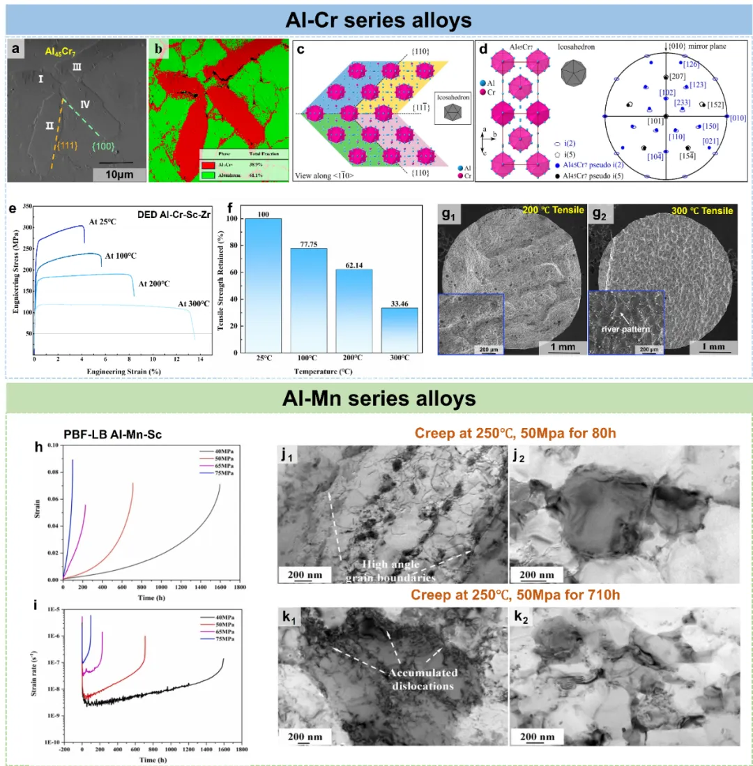 图17、(a,b)铝锌镁铜合金相图及其对应的析出温度范围;(c)热处理试样高温拉伸试验前后的扫描透射电镜图像。(e)沉积态试样与(f)热处理试样的明场TEM图像。(g,h)高温拉伸试验后断裂截面的能量色散X射线衍射图谱(IPF)和金相分析图谱(KAM);(i)沉积态试样与热处理试样的金相分布及(j)取向图谱