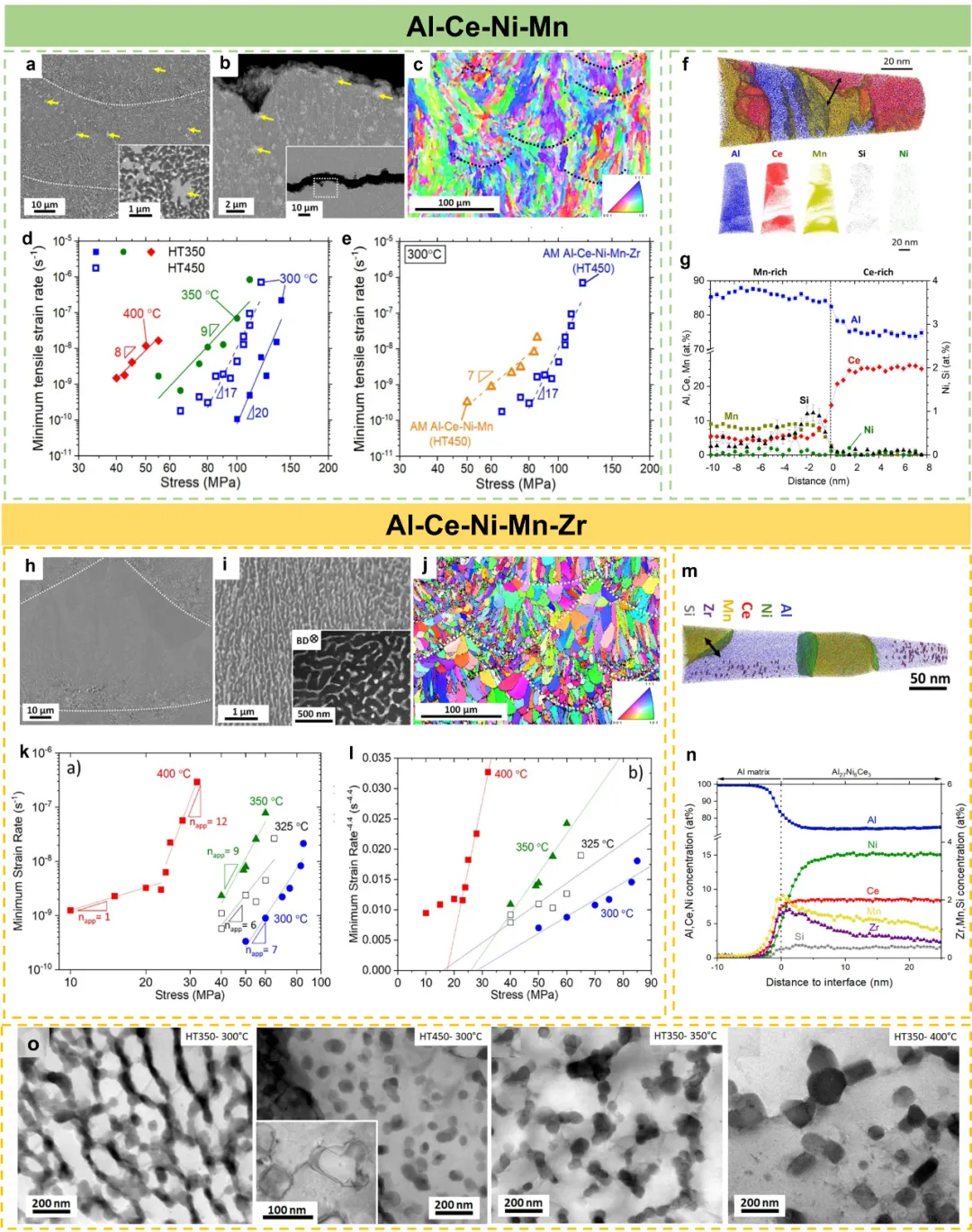 Ce+Ni+Mn:Ce形成Al₁₁Ce₃相,Ni、Mn形成Al₉(Ni,Fe)₂相,多相协同阻碍位错运动,让Al-Ce-Ni-Mn合金在400℃下的蠕变速率比传统合金低1-2个数量级。