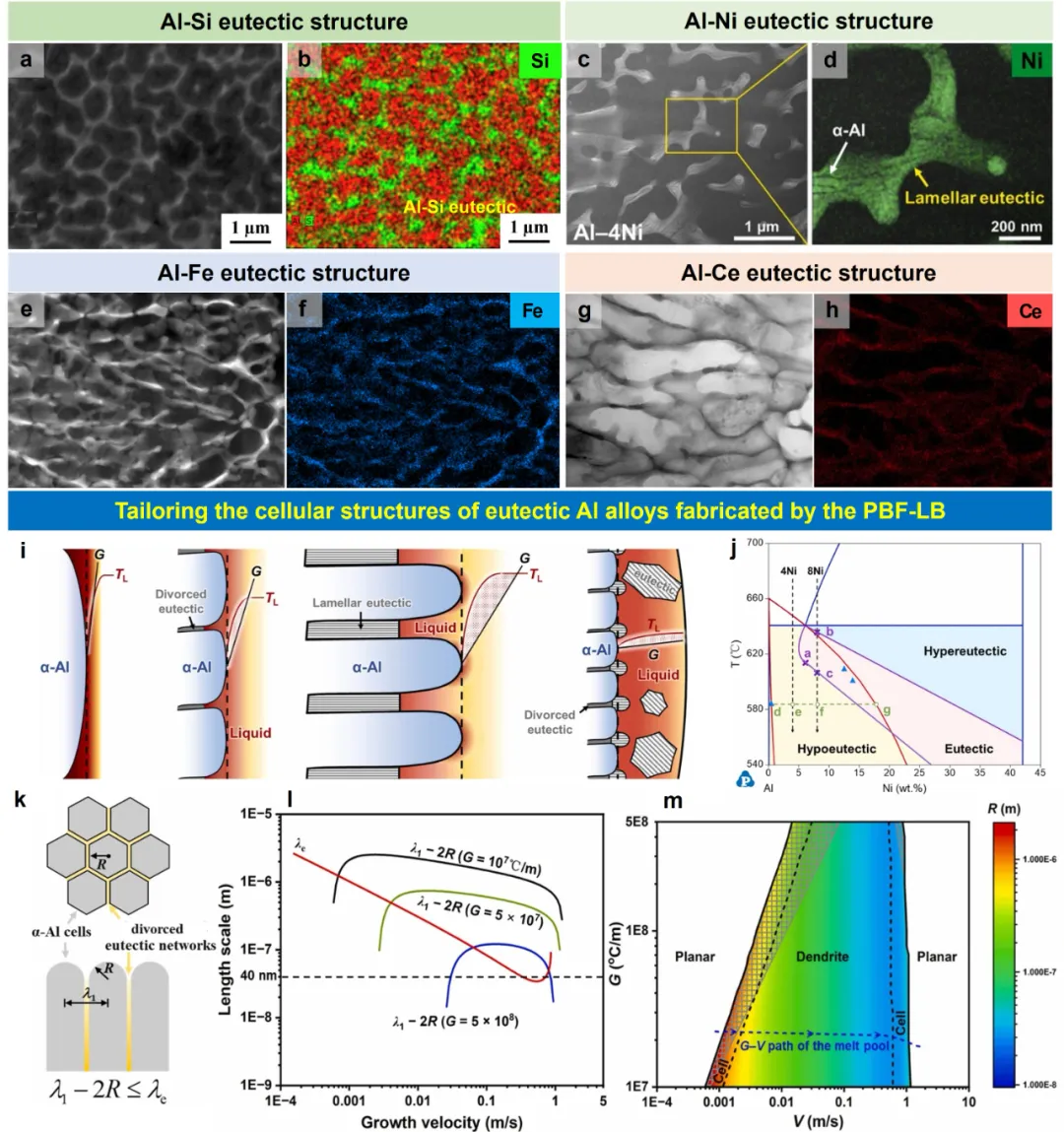 图24、(a,b)铝-硅共晶;(c,d)铝-镍共晶;(e,f)铝-铁共晶;(103,g,h)铝-铈共晶。211(i)液态熔池自下而上S/L界面形貌示意图。(j)铝镍相图富铝侧。(k)α-Al晶胞结构及分离共晶网络示意图;(l)Al-8Ni合金中不同晶界宽度(G)对应λ1−2R和λe随生长速率的变化规律。理论上,晶胞间距/枝晶间距应通过α-Al晶胞间距(λ1)与α-Al尖端直径(2R)之差进行近似计算。(m)Al-5.6Ni合金在G-V空间的显微组织选择图谱