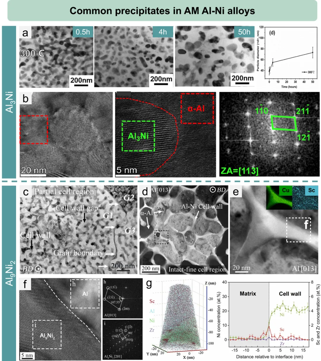 Al-Ni系:Al₃Ni相是核心强化相,PBF-LB打印的Al-5.7Ni合金室温强度407 MPa,300℃仍有143 MPa。若复合添加Sc、Zr,形成“细胞结构+纳米沉淀”双强化,300℃强度可再提升68%;