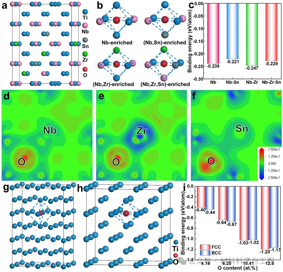 图5 LCO结构和FCC纳米层形成机制的第一性原理计算结果。(a) 33Ti-10Nb-3Zr-2Sn BCC结构超晶胞;(b) 超晶胞中一个氧原子占据的四种位置;(c) 一个氧原子占据的四种位置的结合能;(d)-(f) 电荷差分密度图;(g) 含有间隙氧原子的BCC-Ti超晶胞模型;(h) 含有间隙氧原子的FCC-Ti超晶胞模型;(i) 含有不同含量间隙氧原子的FCC-Ti和BCC-Ti结构的结合